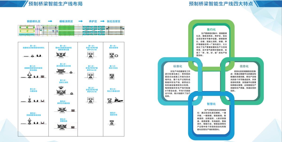 預(yù)制橋梁智能生產(chǎn)線新技術(shù)采用了“施工工序區(qū)域固定、流水線作業(yè)”的預(yù)制新模式:通過自行式移動(dòng)臺(tái)座將鋼筋綁扎區(qū)、模板澆筑區(qū)、養(yǎng)護(hù)區(qū)、張拉壓漿區(qū)和存梁區(qū)有機(jī)串聯(lián),實(shí)現(xiàn)橋梁預(yù)制施工的工廠化流水線作業(yè)。