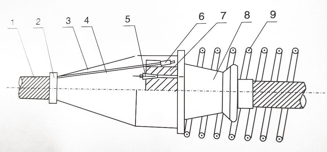 1、波紋管 2、緊篩環(huán) 3、罩殼 4、預應力筋 5、夾片 6、擠壓錨具 7、連接器 8、喇叭管 9、螺旋筋