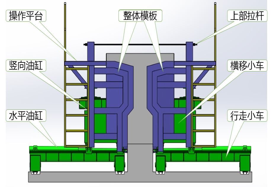 液壓箱梁模板主要由外模、行走小車及液壓系統(tǒng)組成。行走小車及液壓系統(tǒng)實現(xiàn)外模的自動開合。